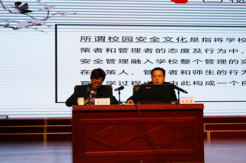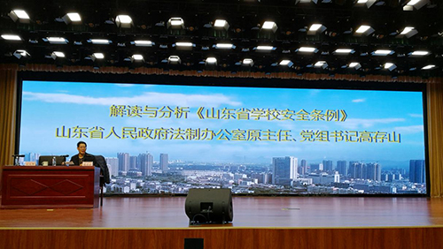 ??本次现场会以“专家讲座+研讨交流+观摩学习+成果展演”相结合的形式展开。山东省人民政府法制办公室原主任、党组书记高存山作“《山东省学校安全条例》解读与分析”专题报告,重点围绕《条例》规定,对做好学校安全应急处置与事故处理,依法妥善处理矛盾纠纷,维护良好的学校教育教学秩序和社会秩序作出了全方位的解析。青岛市教育局孙建国处长、潍坊市教育局王俊杰科长、东营市教育局牛怀明科长则分别从校园安全风险防控、校园安全治理、校园安全文化建设三个方面作了专题报告。